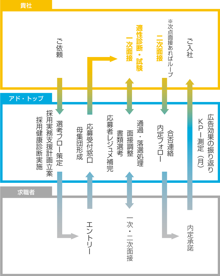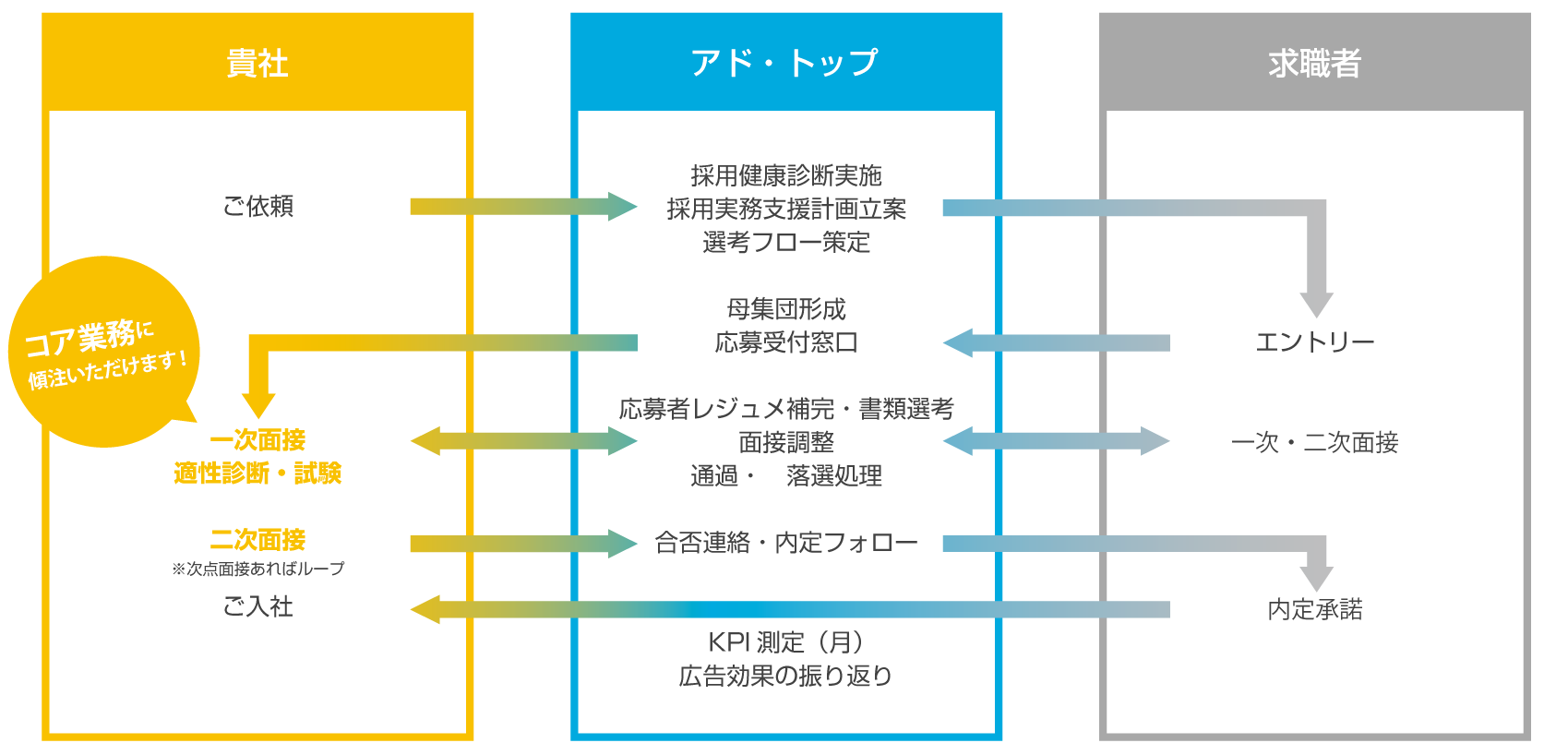 定期的なミーティング・KPIの測定・採用フローの見直しを行い、貴社の採用力強化を全面的に支援します。