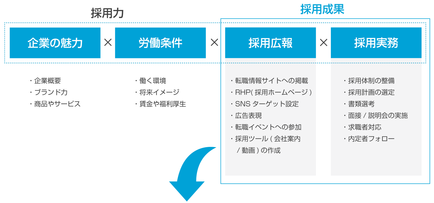 広報力と母集団形成力の強化、採用実務力の強化を網羅的にご支援し、貴社の採用力を一層向上することに貢献します。