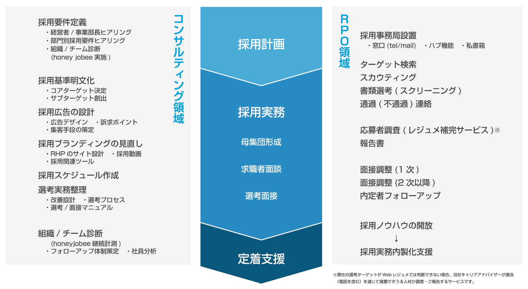 コンサルティング領域と実務代行領域から各サービスを展開しており、計画〜実務〜定着支援まで採用をトータルに支援します。